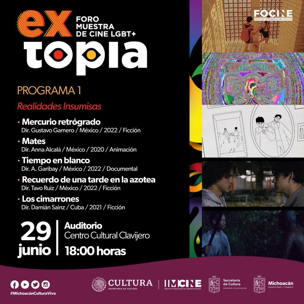 EXTOPIA ofrecerá 10 cortometrajes mexicanos divididos en los programas Realidades Insumisas, y Diversidad sin Miedo, en el auditorio del Clavijero, ubicado en la calle El Nigromante 79, del Centro Histórico de la capital michoacana.