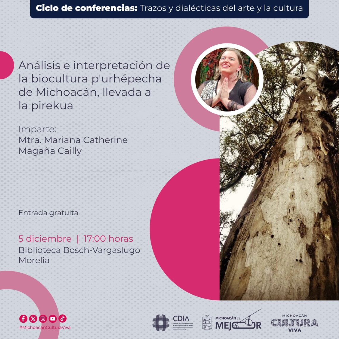 Se invita al público a la conferencia sobre la biocultura purhépecha reflejada en la pirekua, que se llevará a cabo este viernes 5 de diciembre a las 17:00 horas, en la Biblioteca Bosch-Vargaslugo del Centro Cultural Clavijero. La entrada será gratuita.