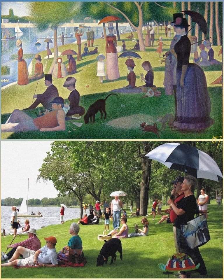 El cuadro de Georges Seurat de 1884 «Una tarde de domingo en la isla de La Grande Jatte» sigue siendo uno de los favoritos de los amantes del arte desde su creación. Esta obra maestra del puntillismo muestra a un grupo de parisinos disfrutando de una tarde en el río Sena. Casi dos siglos después se llevó a cabo la recreación de la famosa escena con la ayuda de voluntarios locales; la imagen final, aunque creada en 2006, aún resuena hoy en día.