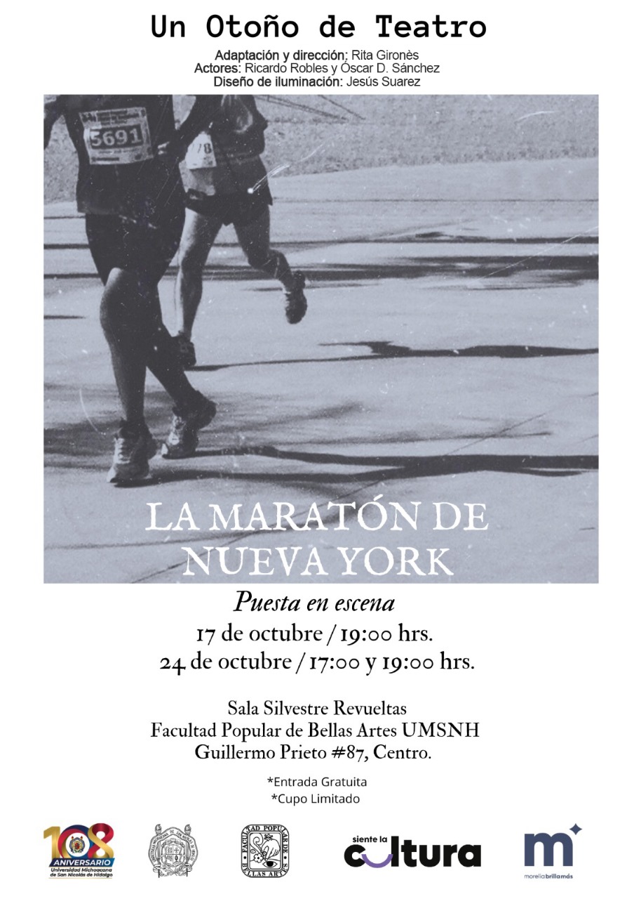 Se invita a la ciudadanía en general a la temporada teatral que se realizará este mes de octubre “Un otoño de teatro”. En esta ocasión, se presentará la puesta en escena “La Maratón de Nueva York”, del dramaturgo italiano Edoardo Erba, una pieza que se enfoca en la preparación física de los personajes, quienes corren durante toda la presentación. Este entrenamiento hace alusión a la metáfora de la vida, la muerte, el esfuerzo, los objetivos, la resistencia, la amistad, los recuerdos y la superación del pasado. La obra se presentará este 17 de octubre, a las 19:00 horas, y el 24 de octubre, con dos funciones programadas a las 17:00…